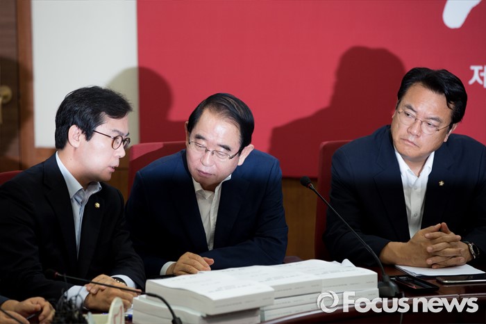 (서울=포커스뉴스) 박명재(가운데) 새누리당 사무총장과 김영우(왼쪽) 의원이 28일 오전 서울 여의도 새누리당사에서 열린 혁신비상대책위원회의에 참석해 의견을 나누고 있다.