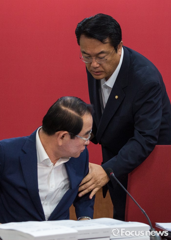 (서울=포커스뉴스) 정진석(오른쪽) 새누리당 원내대표와 박명재 사무총장이 28일 오전 서울 여의도 새누리당사에서 열린 혁신비상대책위원회의에 참석해 대화 하고 있다.