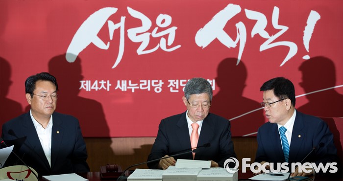 (서울=포커스뉴스) 김희옥(가운데) 새누리당 혁신비상대책위원장과 김광림(오른쪽) 정책위의장이 28일 오전 서울 여의도 새누리당사에서 열린 혁신비상대책위원회의에 참석해 의견을 나누고 있다.