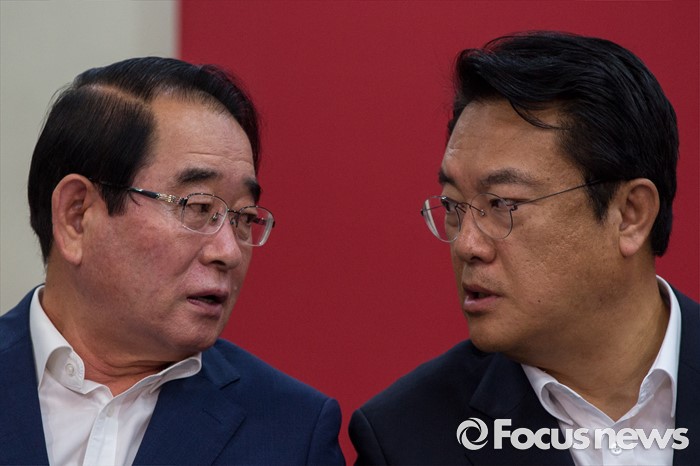 | △ 대화하는 정진석 원내대표-박명재 사무총장 |