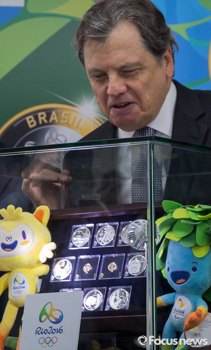 (서울=포커스뉴스) 28일 오전 서울 종로구 주한 브라질대사관에서 루이스 페르난도 세하 주한 브라질 대사가 '2016 리우 올림픽 기념주화'를 공개하고 있다.