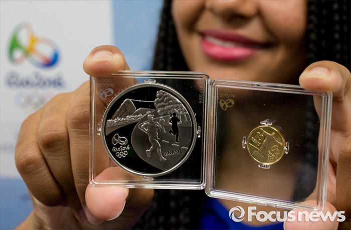 (서울=포커스뉴스) 28일 오전 서울 종로구 주한 브라질대사관에서 현지인 복장의 대사관 직원이 '2016 리우 올림픽 기념주화'를 선보이고 있다.