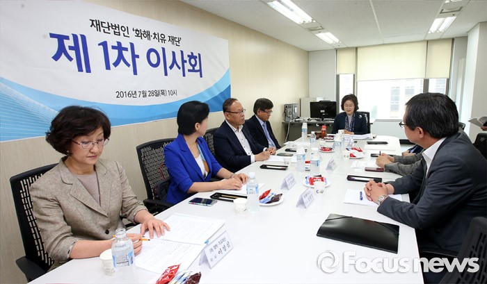 (서울=포커스뉴스) 위안부 지원 재단인 화해 ·치유재단이 공식 출범하는 28일 오전 서울 서대문구 바비엥 스위트에서 김태현 이사장을 비롯한 위원들이 제1차 이사회를 진행하고 있다.