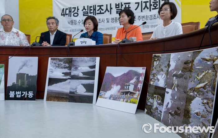 (서울=포커스뉴스) 심상정(왼쪽 세번째) 정의당 상임대표가 28일 오전 서울 여의도 국회에서 열린 낙동강 수질, 퇴적토 조사 및 영풍석포제련소 주변환경조사 관련 4대강 실태조 발표 기자회견에 참석해 인사말을 하고 있다.