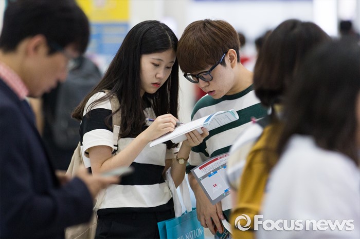 (서울=포커스뉴스) 28일 오전 서울 강남구 코엑스에서 열린 2017학년도 수시 대학입학정보박람회 행사장을 찾은 학생들이 팜플렛을 보고 있다. 이번 박람회는 7월 28일부터 31일까지 나흘간 진행되며 전국 140개 4년제 대학이 참가한다.