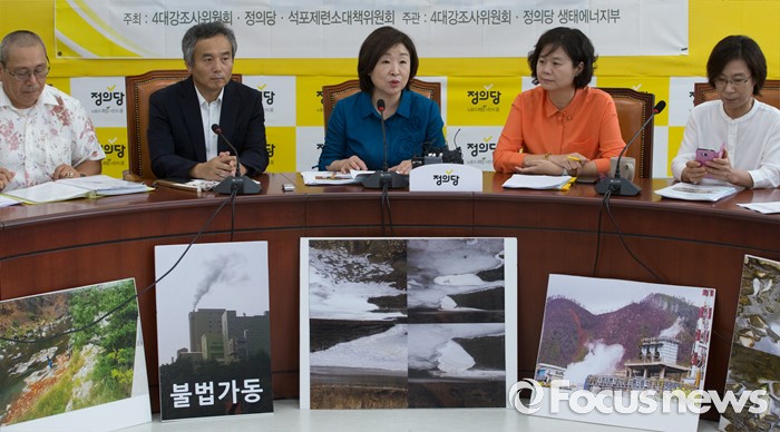 (서울=포커스뉴스) 심상정(왼쪽 세번째) 정의당 상임대표가 28일 오전 서울 여의도 국회에서 열린 낙동강 수질, 퇴적토 조사 및 영풍석포제련소 주변환경조사 관련 4대강 실태조 발표 기자회견에 참석해 인사말을 하고 있다.
