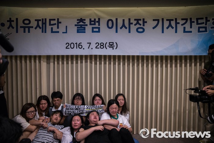 (서울=포커스뉴스) '화해·치유 재단'이 공식 출범한 28일 오전 서울 중구에 위치한 한 건물에서 열린 재단 출범 이사장 기자간담회장에서 재단 출범에 반대하는 대학생들이 회견장을 점거, 농성을 벌이고 있다.