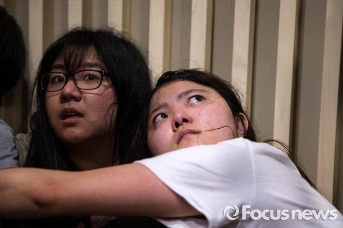 (서울=포커스뉴스) '화해·치유 재단'이 공식 출범한 28일 오전 서울 중구에 위치한 한 건물에서 열린 재단 출범 이사장 기자간담회장에서 재단 출범에 반대하는 대학생들이 회견장을 점거, 농성을 벌이고 있다.