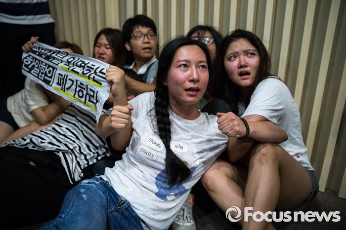 (서울=포커스뉴스) '화해·치유 재단'이 공식 출범한 28일 오전 서울 중구에 위치한 한 건물에서 열린 재단 출범 이사장 기자간담회장에서 재단 출범에 반대하는 대학생들이 회견장을 점거, 농성을 벌이고 있다.
