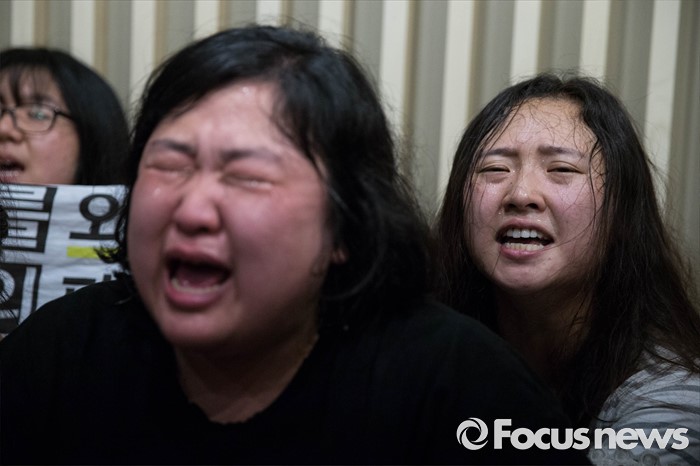 (서울=포커스뉴스) '화해·치유 재단'이 공식 출범한 28일 오전 서울 중구에 위치한 한 건물에서 열린 재단 출범 이사장 기자간담회장에서 재단 출범에 반대하는 대학생들이 회견장을 점거, 농성을 벌이고 있다.