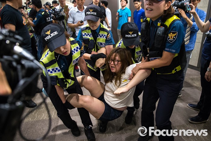 (서울=포커스뉴스) '화해·치유 재단'이 공식 출범한 28일 오전 서울 중구에 위치한 한 건물에서 열린 재단 출범 이사장 기자간담회장에서 재단 출범에 반대하는 대학생들이 회견장을 점거, 농성을 벌이고 있다.