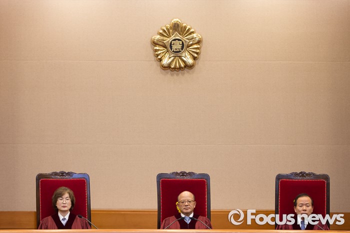 (서울=포커스뉴스) 박한철(가운데) 헌법재판소장과 법관들이 김영란법 위헌 여부 판결을 위해 28일 오후 서울 종로구 헌법재판소 대심판정에 착석해 있다.