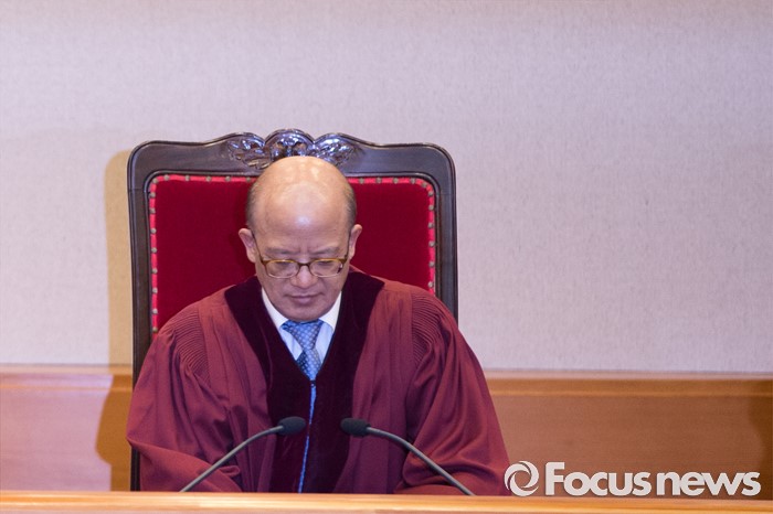 (서울=포커스뉴스) 박한철 헌법재판소장이 김영란법 위헌 여부 판결을 위해 28일 오후 서울 종로구 헌법재판소 대심판정에 착석하고 있다.