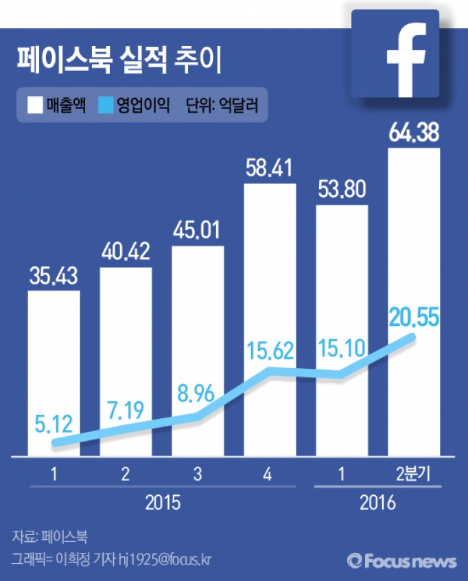 (서울=포커스뉴스) 27일(현지시간) 페이스북은 2016년 매출액 64억 3800만달러, 영업이익은 전년동기대비 86%증가한 20억 5500만달러를 기록했다고 공시했다.
