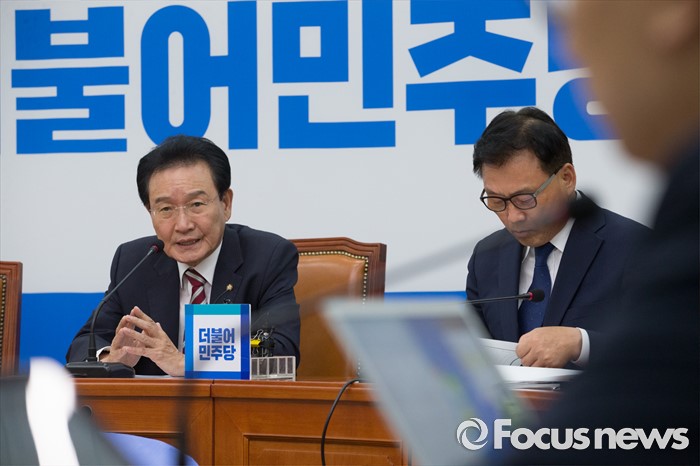 (서울=포커스뉴스) 28일 오후 서울 여의도 국회에서 열린 더불어민주당 정부세법개정안 관련 입장발표 기자간담회에 참석한 변재일 정책위의장이 발언하고 있다. 오른쪽은 박광온 기획재정위원회 간사.