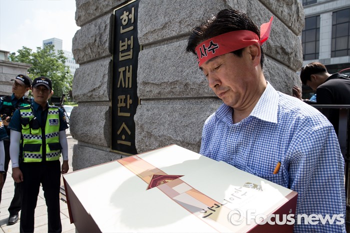 (서울=포커스뉴스) 부정청탁 및 금품 등 수수 금지, 김영란법이 합헌 판결이 난 28일 오후 서울 종로구 헌법재판소 앞에서 한국농축산연합회원이 판결을 반대하며 법이 적용된 5만원 한우세트를 들고 시위하고 있다.