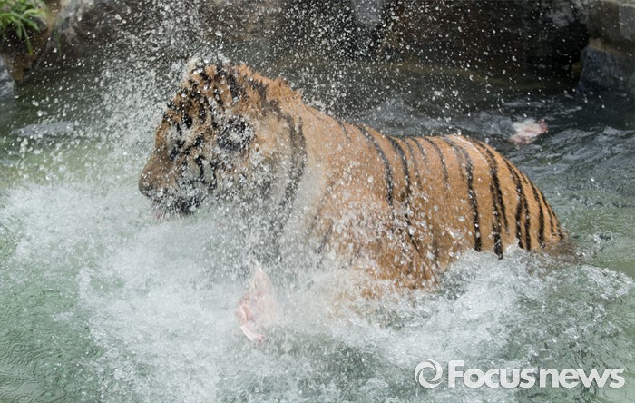 (과천=포커스뉴스) 28일 오후 경기도 과천 서울동물원에서 시베리아 호랑이가 얼린 닭고기를 먹으며 몸에 묻은 물기를 털어내고 있다.