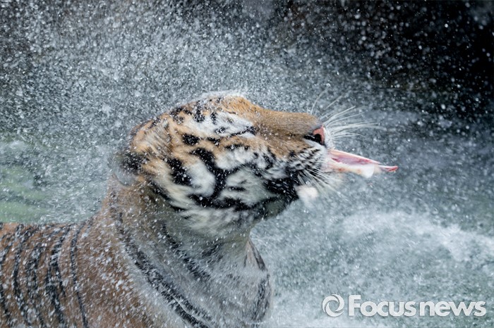 (과천=포커스뉴스) 28일 오후 경기도 과천 서울동물원에서 시베리아 호랑이가 얼린 닭고기를 먹으며 몸에 묻은 물기를 털어내고 있다.