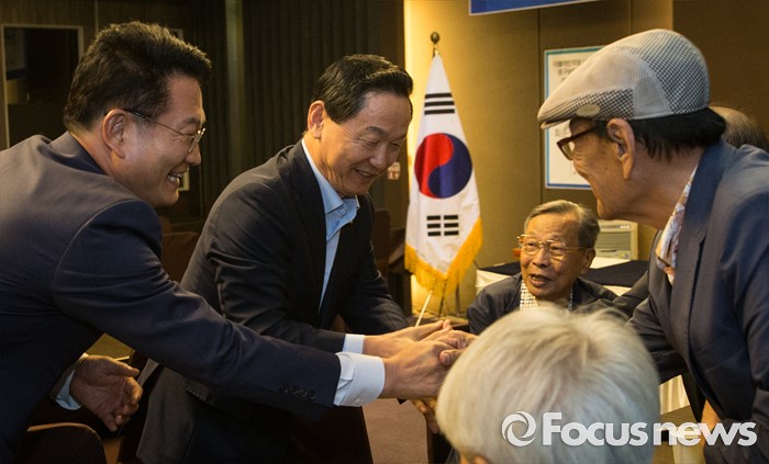 (서울=포커스뉴스) 더불어민주당 송영길(왼쪽) 의원과 김상곤(가운데) 전 혁신위원장이 28일 오후 서울 성동구 레노스블랑쉬 웨딩홀에서 열린 서울 중구·성동갑 지역대의원대회에서 참석자들과 인사하고 있다.