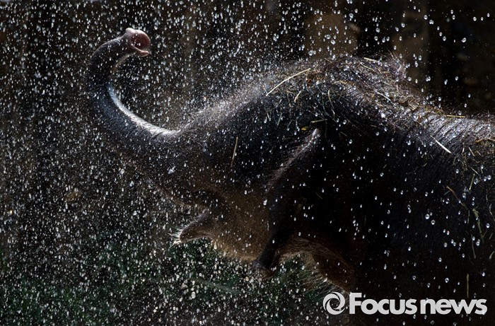 (과천=포커스뉴스) 28일 오후 경기도 과천 서울동물원에서 아기 코끼리가 물줄기를 맞으며 더위를 식히고 있다.
