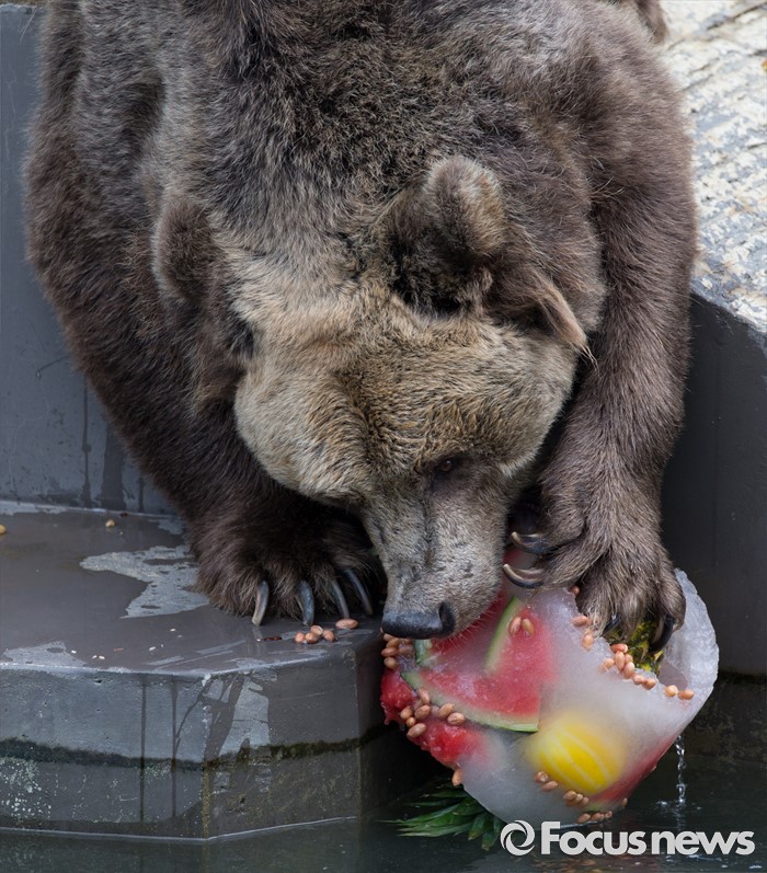 (과천=포커스뉴스) 28일 오후 경기도 과천 서울동물원에서 불곰이 얼음과일을 먹고 있다.