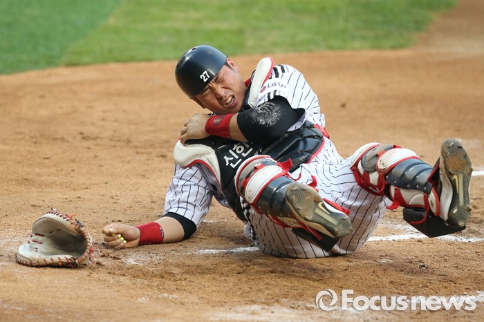 (서울=포커스뉴스) 28일 오후 서울 잠실구장에서 열린 2016 타이어뱅크 KBO리그 롯데-LG 경기에서 2회초 롯데 강민호의 파울 타구에 맞은 LG 포수 유강남이 고통스러워하고 있다.