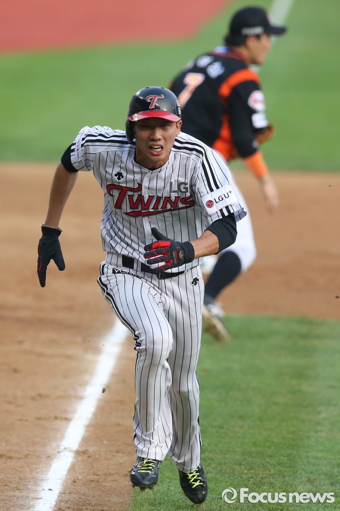 (서울=포커스뉴스) 28일 오후 서울 잠실구장에서 열린 2016 타이어뱅크 KBO리그 롯데-LG 경기에서 1회말 LG 김용의가 런다운 플레이 중 롯데 강민호의 송구실책으로 홈으로 향하고 있다.