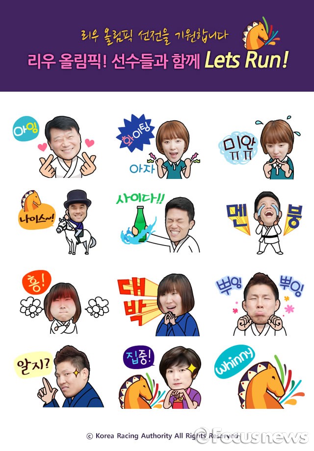 (서울=포커스뉴스) 한국마사회는 렛츠런파크 스포츠단이 2016년 리우올림픽에 출전하는 소속 선수들의 선전을 기원하고자 '리우 올림픽! 선수들과 함께 Lets Run!' 이모티콘을 제작, 무료 배포하고 있다고 28일 밝혔다.