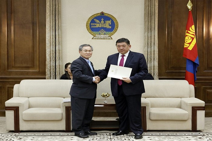 (서울=포커스뉴스) 몽골 국회 사무총장의 공식 초청으로 몽골을 방문 중인 우윤근(왼쪽) 국회 사무총장이 28일 몽골 국회를 방문해 몽골 엥흐볼드(Miyagombo ENKHBOLD) 국회의장과 면담에 앞서 정세균 국회의장의 축전을 전달하고 있다. <사진제공=국회사무처>