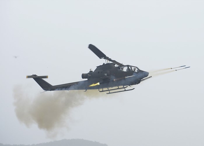 (서울=포커스뉴스) 28일 인천 백령도에서 실시된 서북도서방위사령부 해상사격에 참가한 해병대 6여단 코브라 공격헬기가 2.75인치 로켓을 발사하고 있다. <사진제공=해병대사령부>