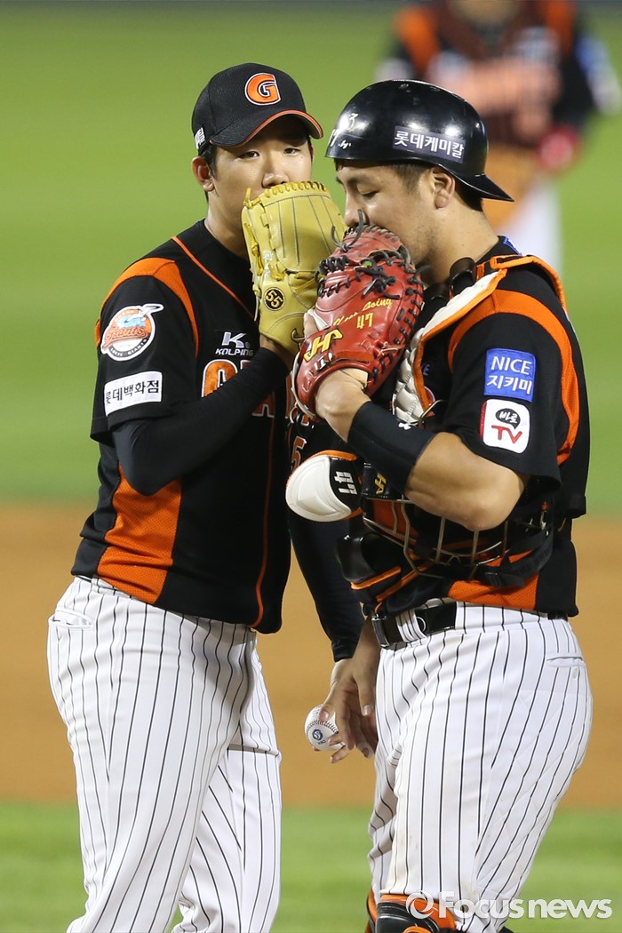 (서울=포커스뉴스) 28일 오후 서울 잠실구장에서 열린 2016 타이어뱅크 KBO리그 롯데-LG 경기에서 5회말 롯데 투수 김유영이 등판해 포수 강민호와 이야기하고 있다.