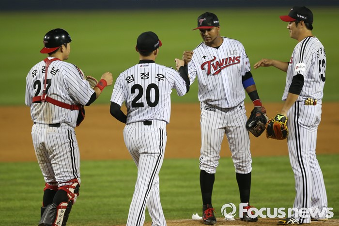 (서울=포커스뉴스) 28일 오후 서울 잠실구장에서 열린 2016 타이어뱅크 KBO리그 롯데-LG 경기에서 롯데에 5-2으로 2점차 승리한 LG 선수들이 마운드에 모여 함께 기뻐하고 있다.