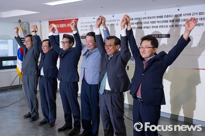 (서울=포커스뉴스) 새누리당 전당대회 당대표 후보들이 29일 오전 서울 여의도 새누리당사에서 열린 '4차 전당대회 혁신과 화합의 선거 서약식'에 참석해 손을 들고 사진촬영을 하고 있다. 왼쪽부터 주호영 의원, 이주영 의원, 정병국 의원, 한선교 의원, 이정현 의원, 김용태 의원.
