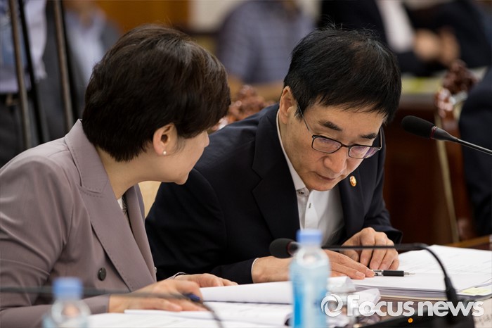 (서울=포커스뉴스) 29일 오전 서울 종로구 정부서울청사에서 열린 국가정책조정회의에 참석한 강은희(왼쪽) 여성가족부 장관과 이준식 사회부총리 겸 교육부 장관이 대화하고 있다.