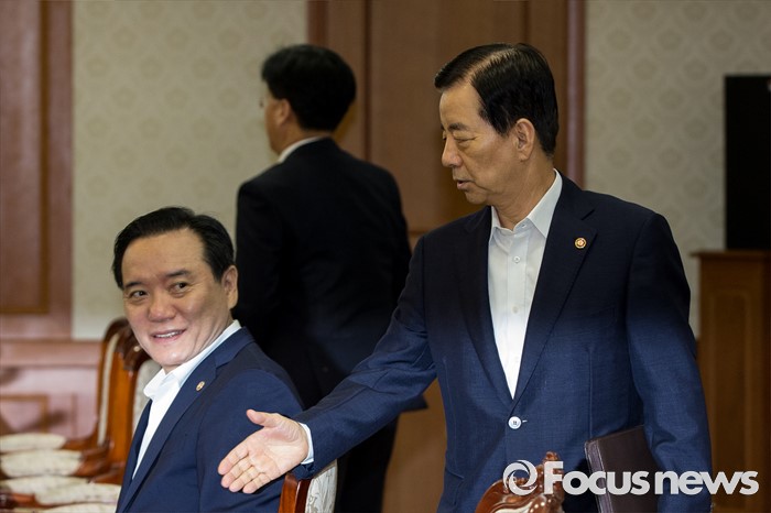 (서울=포커스뉴스) 한민구(오른쪽) 국방장관이 29일 오전 서울 종로구 정부서울청사에서 국가정책조정회의에 참석해, 김현웅 법무부 장관에게 악수를 청하고 있다.