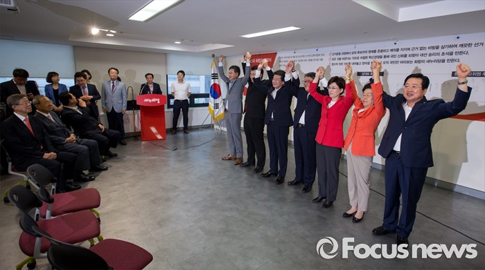 (서울=포커스뉴스) 새누리당 전당대회 최고위원 후보들이 9일 오전 서울 여의도 새누리당사에서 열린 '4차 전당대회 혁신과 화합의 선거 서약식'에 참석해 사진촬영을 하고 있다. 왼쪽부터 정문헌, 정용기, 강석호, 조원진, 최연혜, 이은재, 이장우 후보.