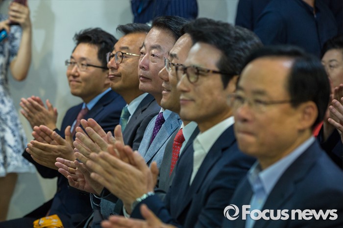 (서울=포커스뉴스) 새누리당 전당대회 당대표 후보들이 9일 오전 서울 여의도 새누리당사에서 열린 '4차 전당대회 혁신과 화합의 선거 서약식'에 참석해 박수 치고 있다. 왼쪽부터 김용태, 이정현, 한선교, 주호영, 정병국, 이주영 후보.