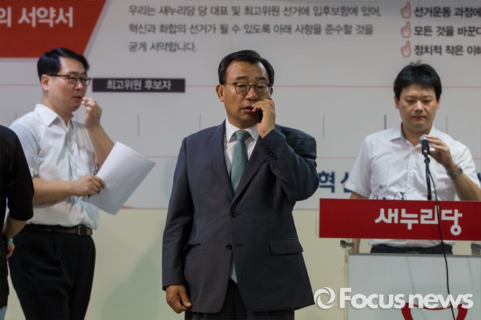 (서울=포커스뉴스) 이정현 새누리당 의원이 9일 오전 서울 여의도 새누리당사에서 열린 '4차 전당대회 혁신과 화합의 선거 서약식'에 참석해 전화통화를 하고 있다.