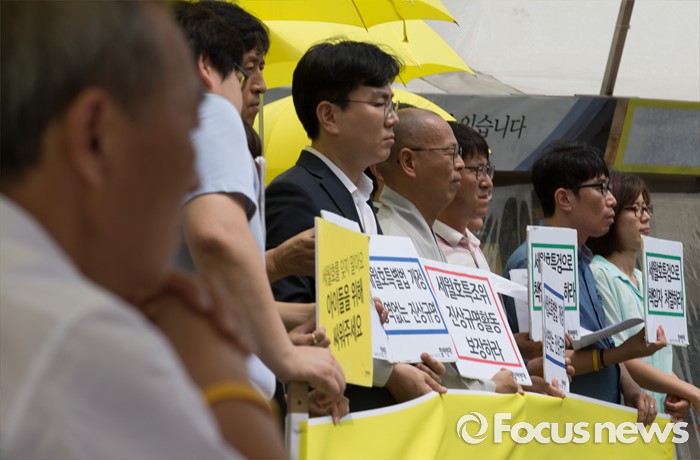 (서울=포커스뉴스) 이석태 세월호참사 특별조사위원회 위원장이 29일 오후 서울 광화문광장에서 열린 세월호특조위 진상규명활동 보장 촉구 기자회견을 바라보고 있다.
