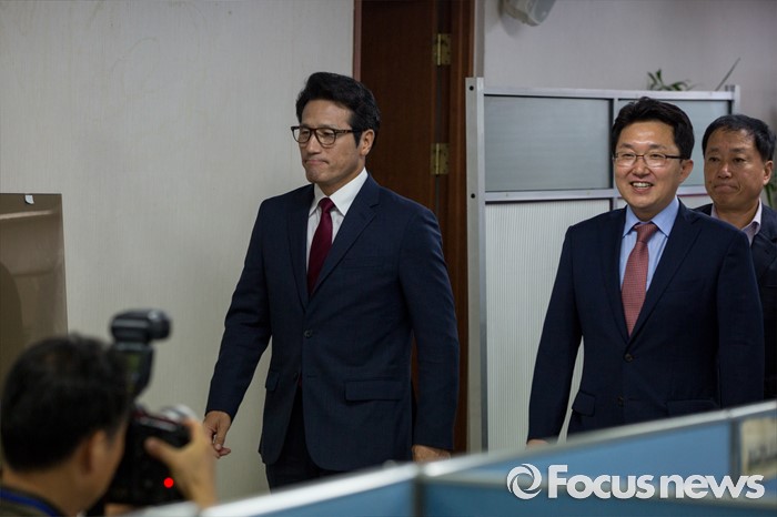 (서울=포커스뉴스) 새누리당 전당대회 대표최고위원 출마를 선언한 정병국(왼쪽), 김용태 의원이 29일 오후 서울 여의도 당사에서 단일화 발표 기자회견을 하기 위해 브리핑실로 들어서고 있다. 이날 두 의원은 여론조사를 통해 정병국 의원으로 단일화를 결정했다.