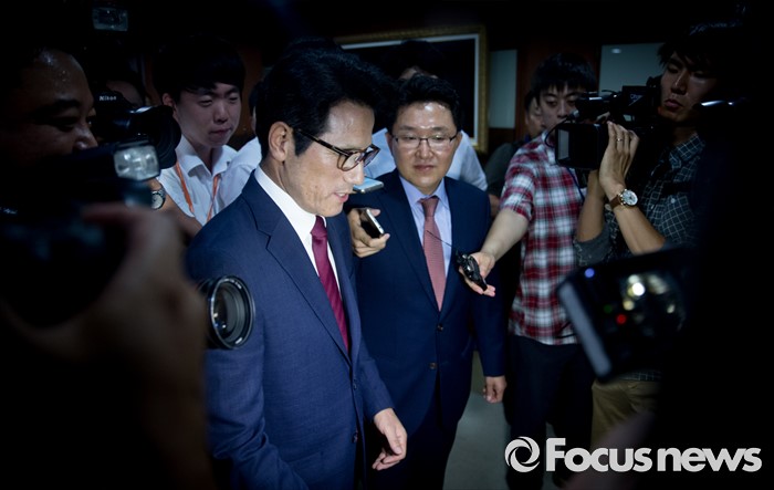 (서울=포커스뉴스) 전당대회 대표최고위원 출마를 선언한 정병국(왼쪽), 김용태 새누리당 의원이 29일 오후 서울 여의도 당사에서 단일화 발표 기자회견을 마친 뒤 퇴장하고 있다. 이날 두 의원은 여론조사를 통해 정병국 의원으로 단일화를 결정했다.