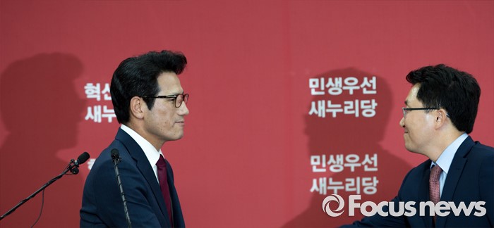 (서울=포커스뉴스) 새누리당 전당대회 대표최고위원 출마를 선언한 정병국(왼쪽), 김용태 의원이 29일 오후 서울 여의도 당사에서 단일화 발표 기자회견을 마친 뒤 악수 하고 있다. 이날 두 의원은 여론조사를 통해 정병국 의원으로 단일화를 결정했다.