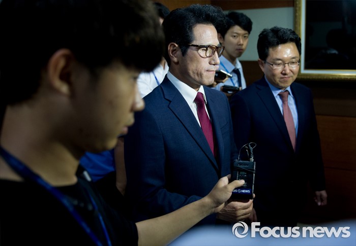 (서울=포커스뉴스) 전당대회 대표최고위원 출마를 선언한 정병국(왼쪽), 김용태 새누리당 의원이 29일 오후 서울 여의도 당사에서 단일화 발표 기자회견을 마친 뒤 이동하고 있다. 이날 두 의원은 여론조사를 통해 정병국 의원으로 단일화를 결정했다.
