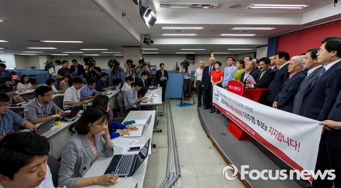 (서울=포커스뉴스) 새누리당 중앙위원회 관계자들이 29일 오후 서울 여의도 새누리당사 브리핑실에서 전당대회 당대표에 출마한 이주영 의원을 공개 지지 선언 하고 있다.