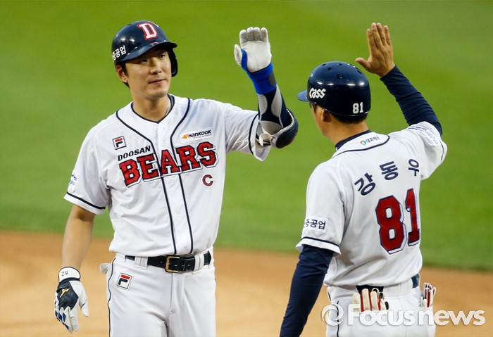(서울=포커스뉴스) 26일 서울 잠실구장에서 열린 2016 프로야구 한화-두산 경기에서 2회말 두산 김재호가 안타로 1타점을 올린 후 강동우 코치와 손뼉을 치고 있다.