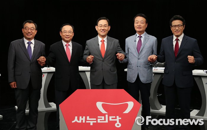 (서울=포커스뉴스) 29일 오후 서울 마포구 상암동 DMC에서 종합편성채널 채널A 주최로 열린 새누리당 대표 경선 1차 토론회에 참석한 의원들이 토론에 앞서 포즈를 취하고 있다. 왼쪽부터 이정현, 이주영, 주호영, 한선교, 정병국 의원.