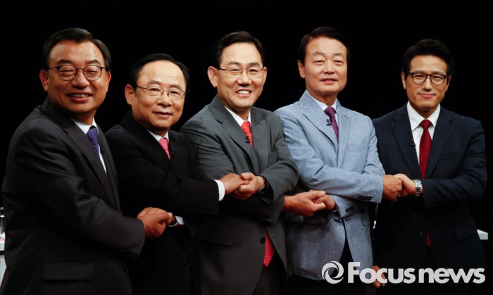 (서울=포커스뉴스) 29일 오후 서울 마포구 상암동 DMC에서 종합편성채널 채널A 주최로 열린 새누리당 대표 경선 1차 토론회에 참석한 의원들이 토론에 앞서 포즈를 취하고 있다. 왼쪽부터 이정현, 이주영, 주호영, 한선교, 정병국 의원.