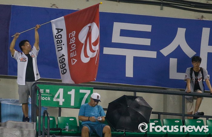 (서울=포커스뉴스) 26일 서울 잠실구장에서 열린 2016 프로야구 한화-두산 경기에서 한 관중이 한화이글스 깃발을 흔들며 응원하고 있다.