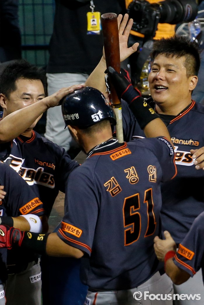(서울=포커스뉴스) 26일 서울 잠실구장에서 열린 2016 프로야구 한화-두산 경기 연장 11회초 2사 상황에서 한화 김경언이 역전 홈런을 친 후 동료들의 축하를 받고 있다.