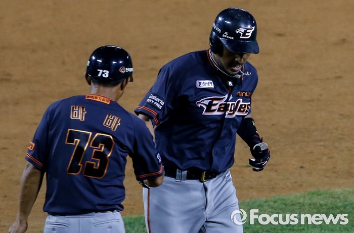 (서울=포커스뉴스) 26일 서울 잠실구장에서 열린 2016 프로야구 한화-두산 경기 연장 11회초 2사 상황에서 한화 김경언이 역전 홈런을 친 후 홈으로 향하고 있다.